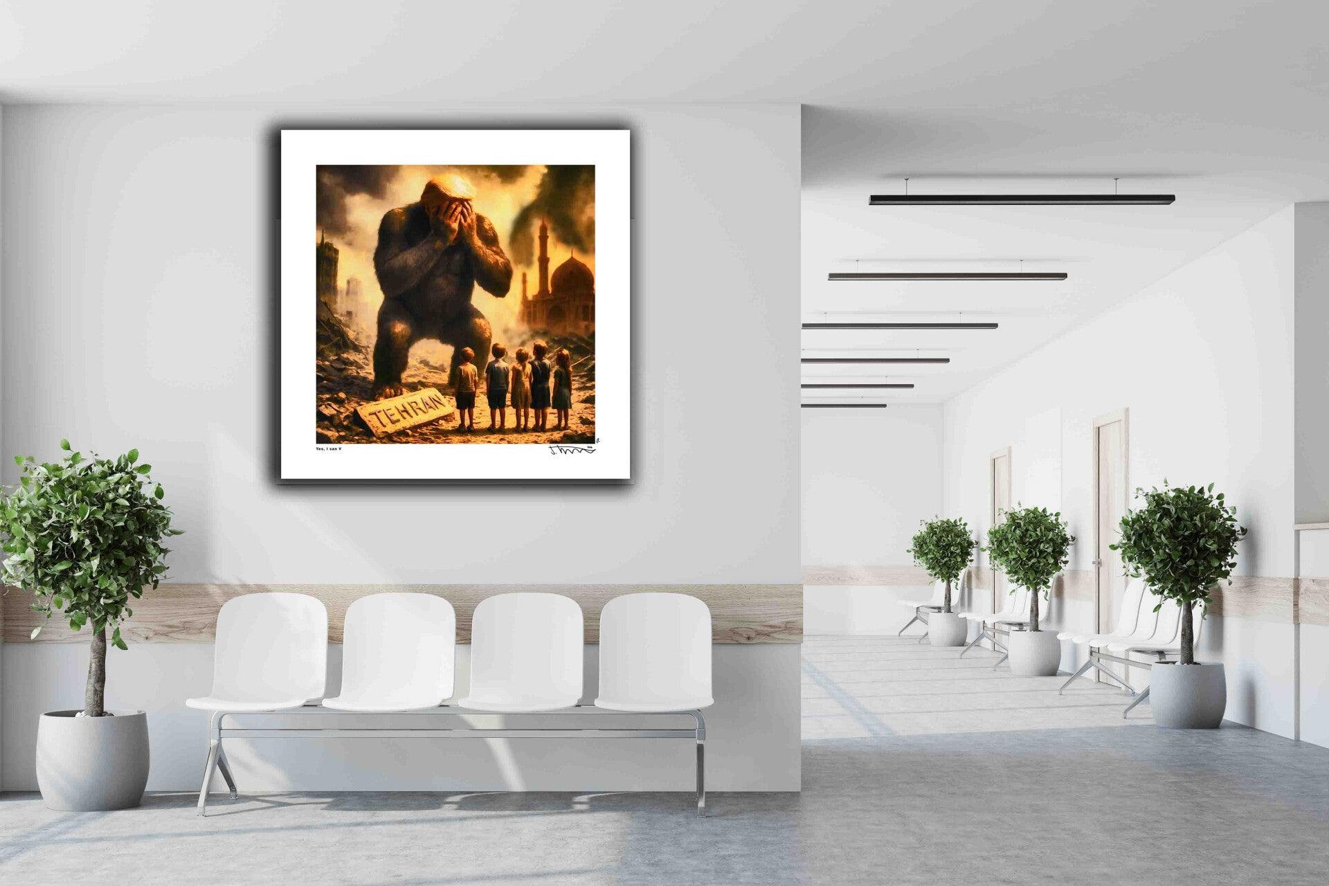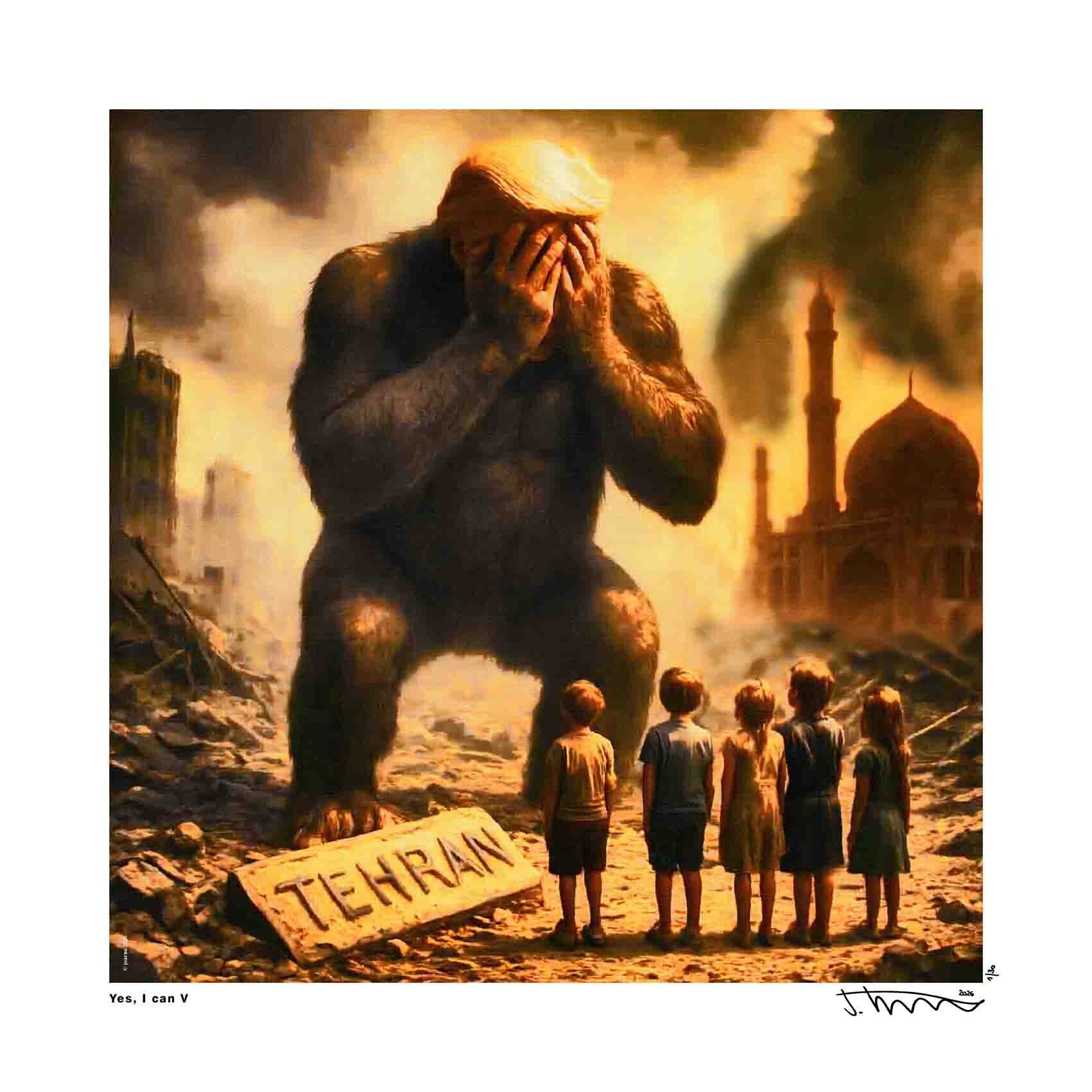 In diesem Werk habe ich versucht reale Zerstörung mit symbolischer Beschämung zu verbinden. Anklagende und fragende Kinder die das Tun um sie herum nicht verstehen. Das Tier in Menschengestalt möchte den Blicken seiner Opfer nicht offen begegnen. Der Betrachter des Werkes wird mit der Fülle gesetzloser Macht konfrontiert und sieht sich, wie die Kinder im Bild, als hilfloser Zuschauer. Ein Moment der Zeitgeschichte. März 2026.