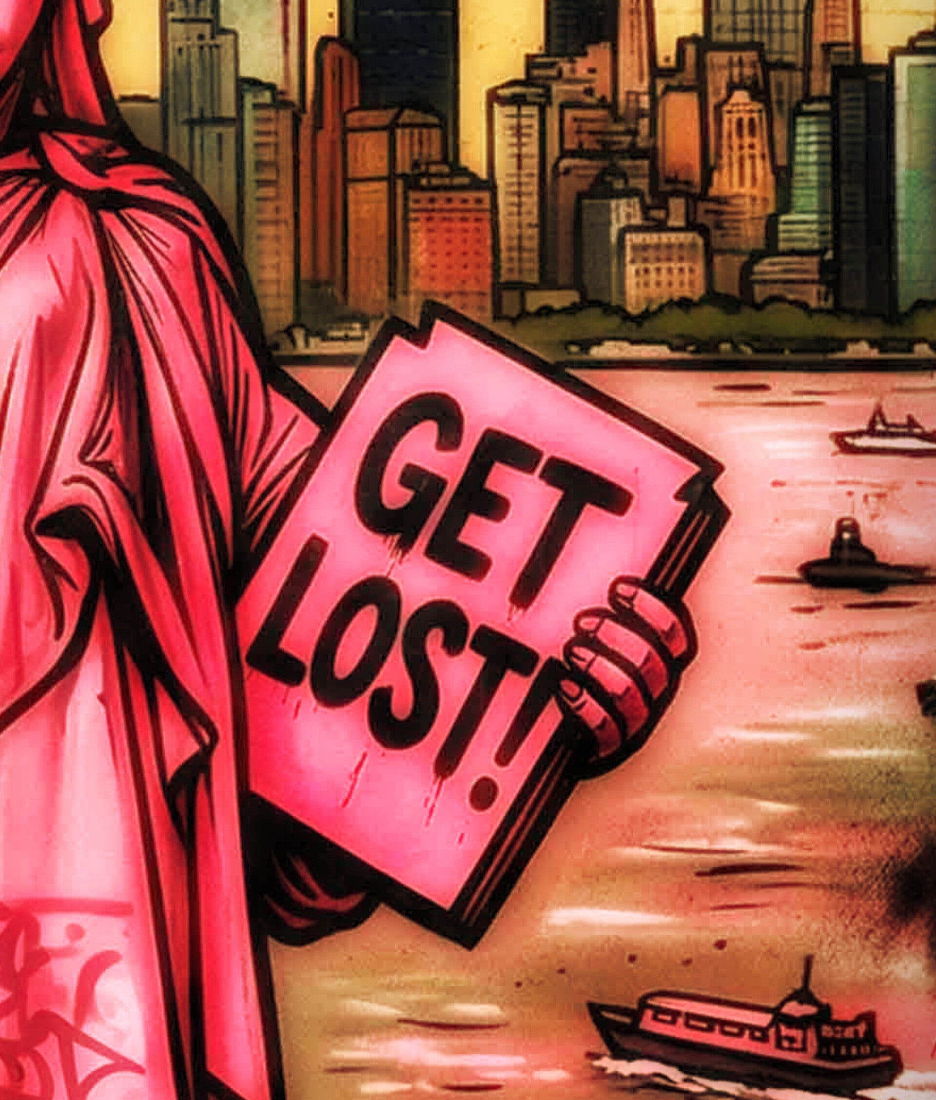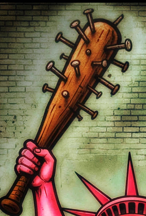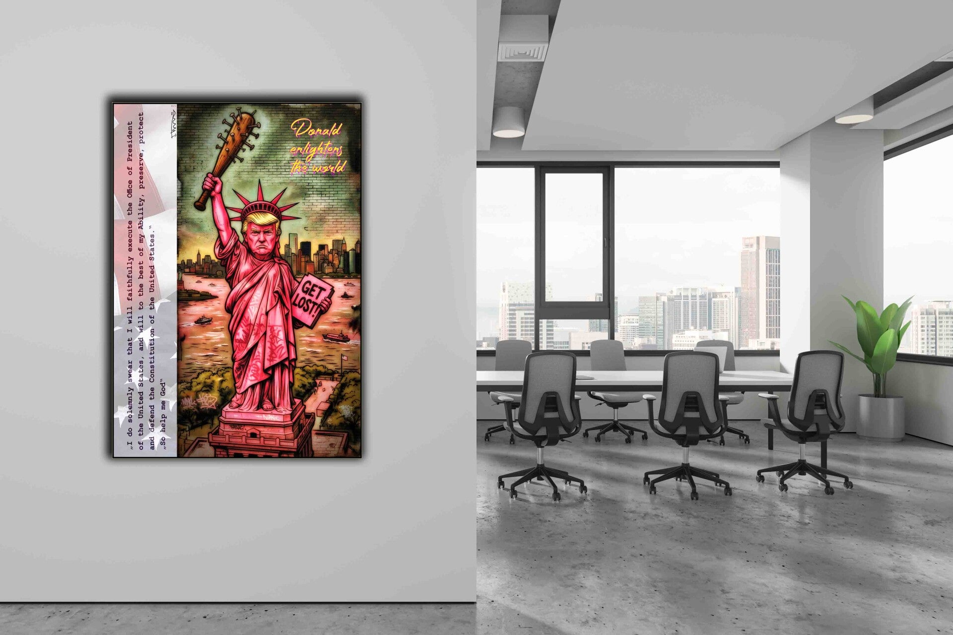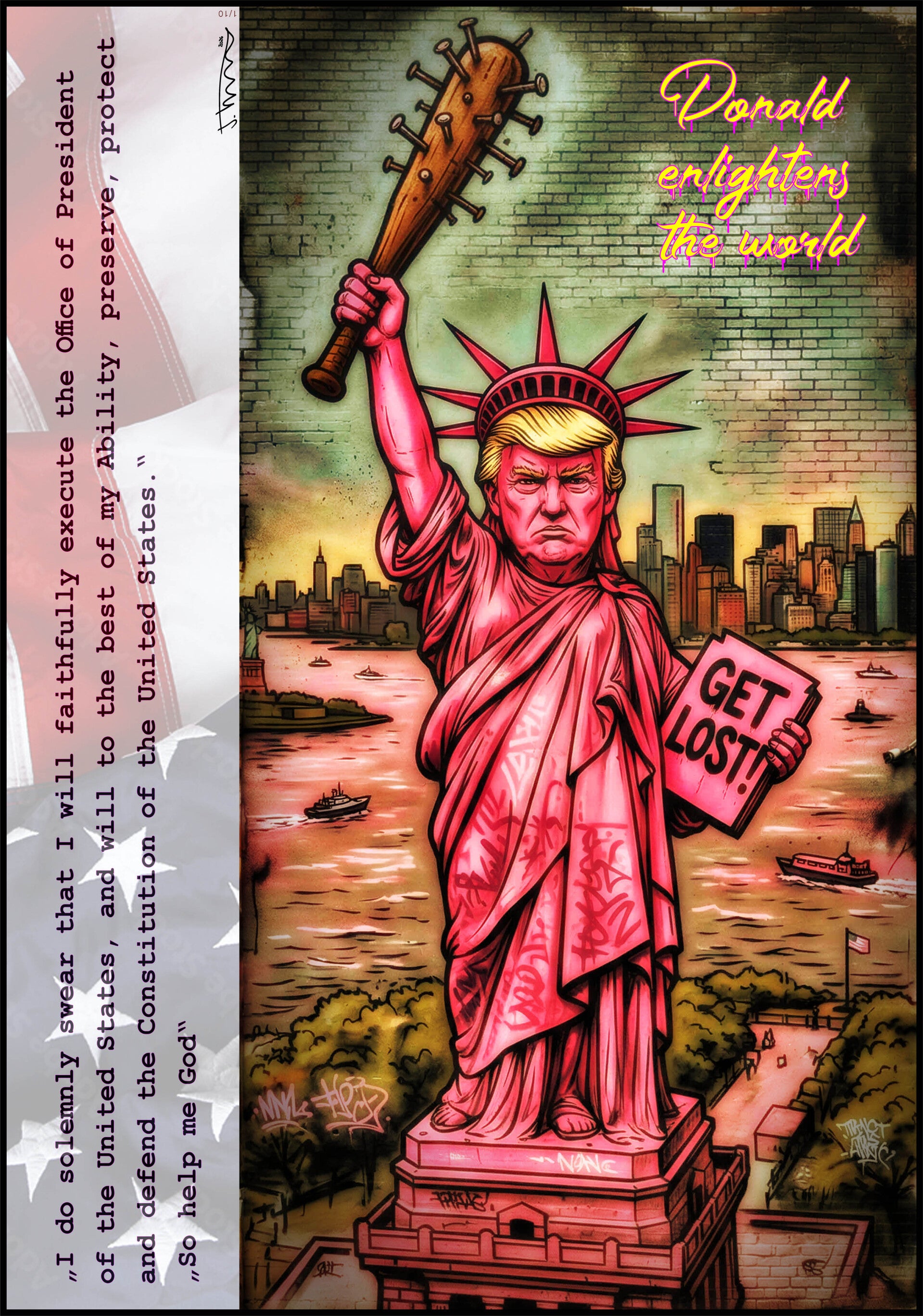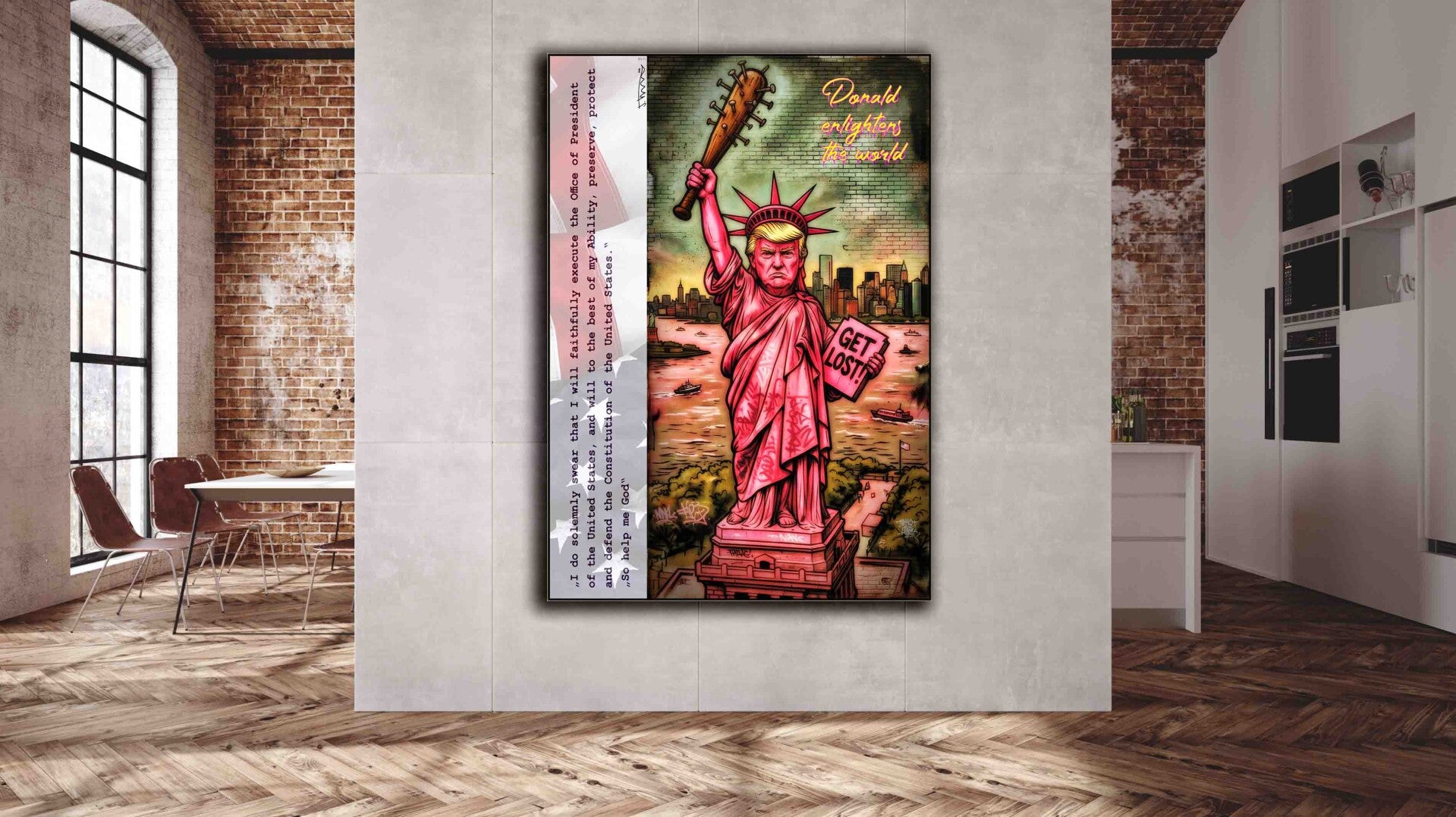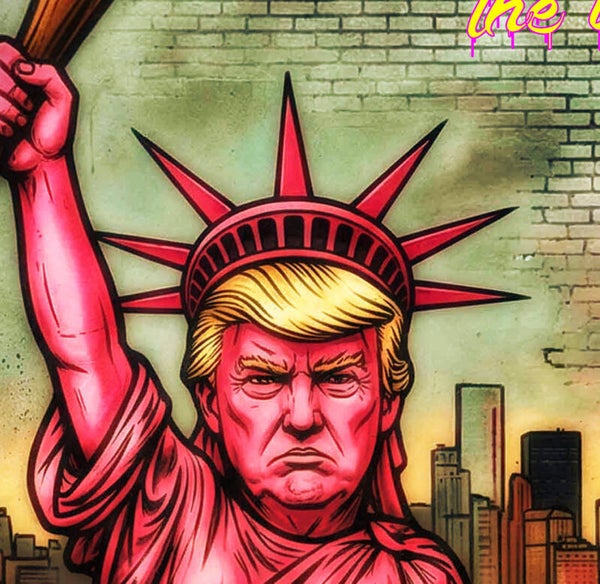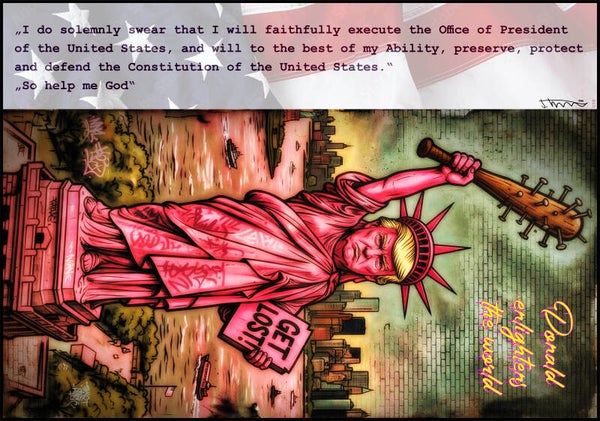 Dieses ironische Werk fängt die niemals erhoffte Spannung zwischen Macht und Provokation ein. Ich wollte zeigen, wie Symbolik und Pop-Art die heutige politische Landschaft kommentieren können. Die aggressive Energie soll Spannung erzeugen und den Betrachter herausfordern, über Freiheit und Autorität nachzudenken. Dieses Werk sprüht vor Dynamik und lässt eine unvergessliche Atmosphäre entstehen.