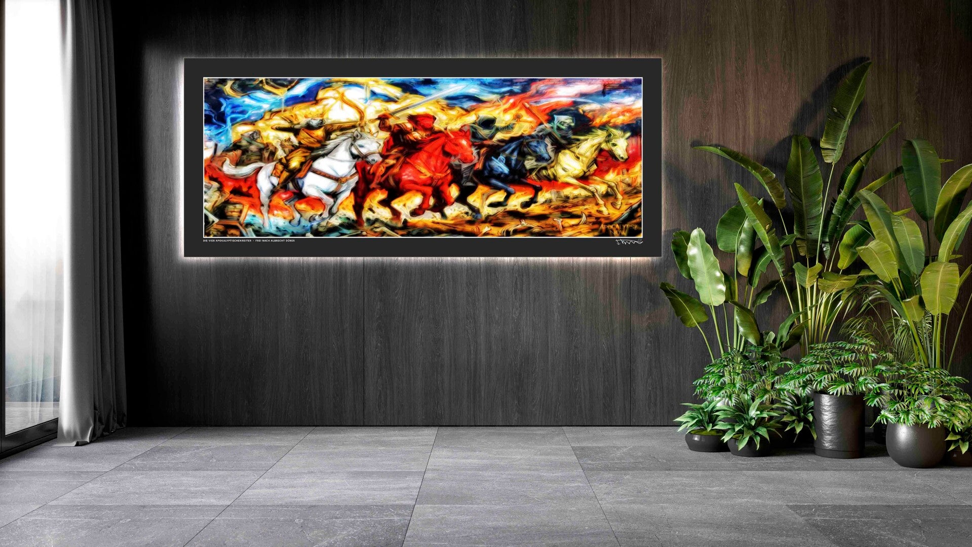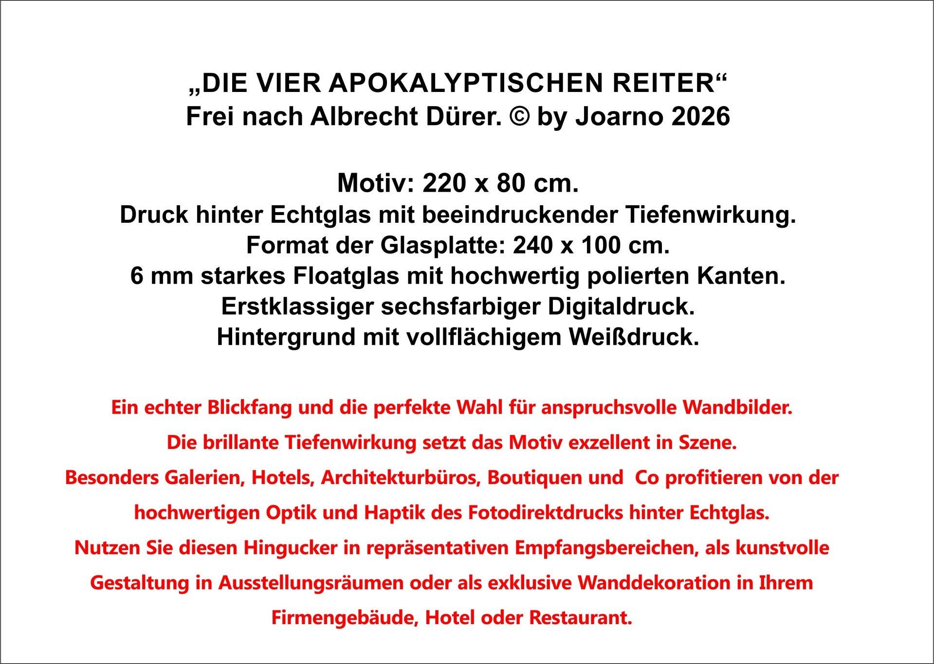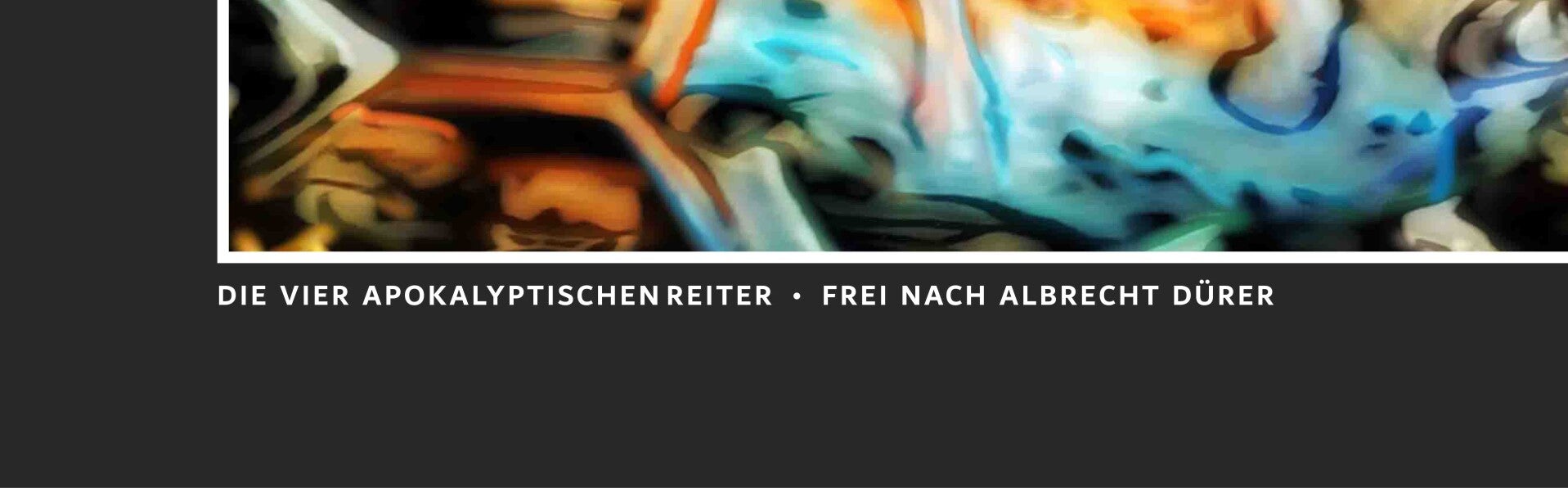 Mit diesem farbkräftigem Werk wollte ich die Magie und das unaufhaltsame Wesen der vier apokalyptischen Reiter -frei nach Albrecht Dürer- in seiner fast monumentalen Gänze einfangen – ein Blick zwischen Chaos und Ordnung, Realität und Traum. Die abstrakten, symbolischen Formen sollen den Betrachter in eine metaphysische Welt voller Spannung und Energie entführen. Dem großen Meister der Kupferstichvorlage sei Dank.